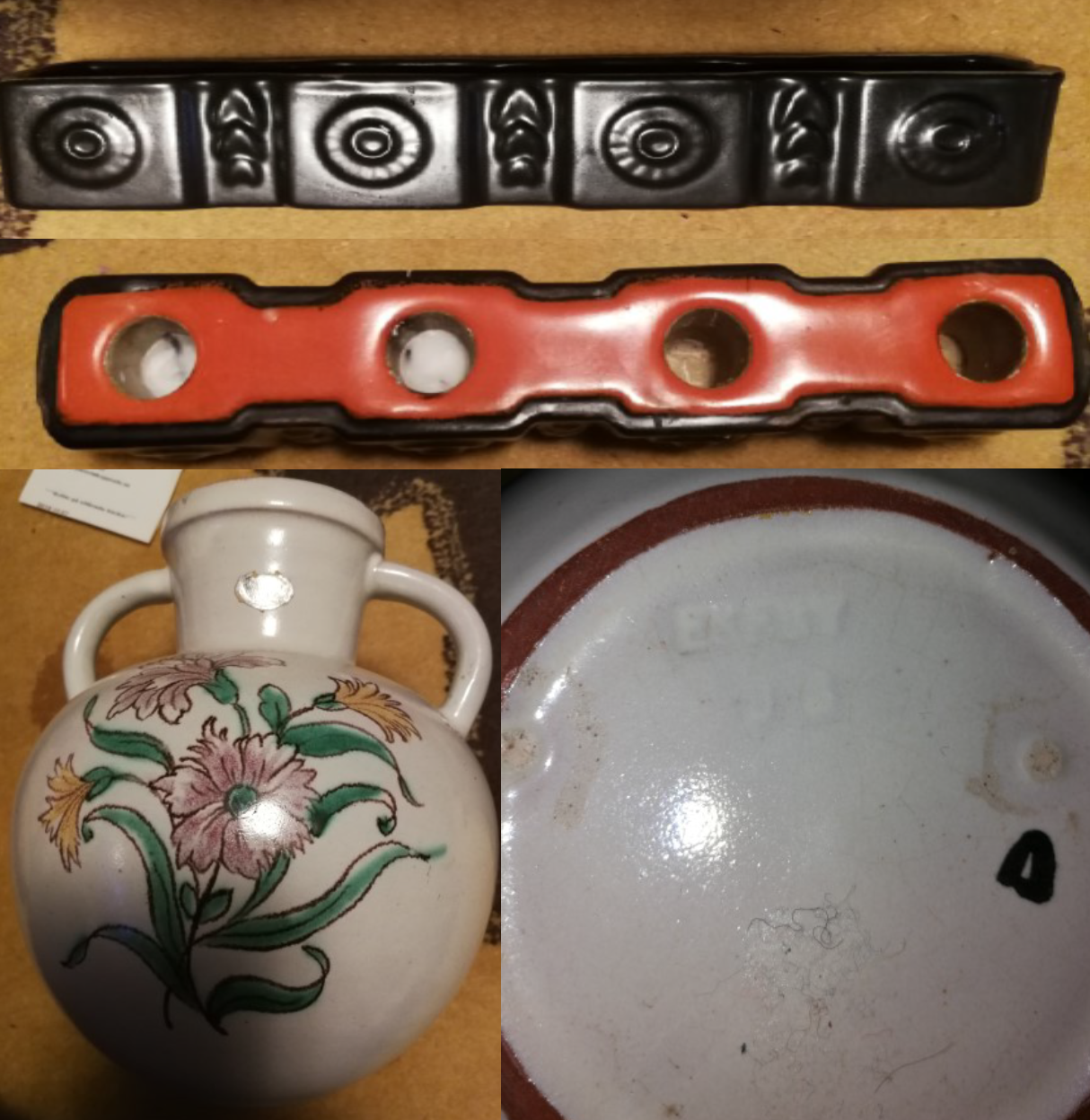 Fråga: Hittade nya fynd i Gävle i helgen men är lite osäker på formgivare, samt om adventsljusstaken överhuvudtaget är ett UE objekt. Objekt 1, en adventsljusstake, ca 5 * 28 cm, finns ingen stämpel. Objekt 2, vas (?) med två hänklar, blommotiv, ca 19 * 15 cm, Ekeby 98 (kanske 93) Hoppas du kan hjälpa mig igen!